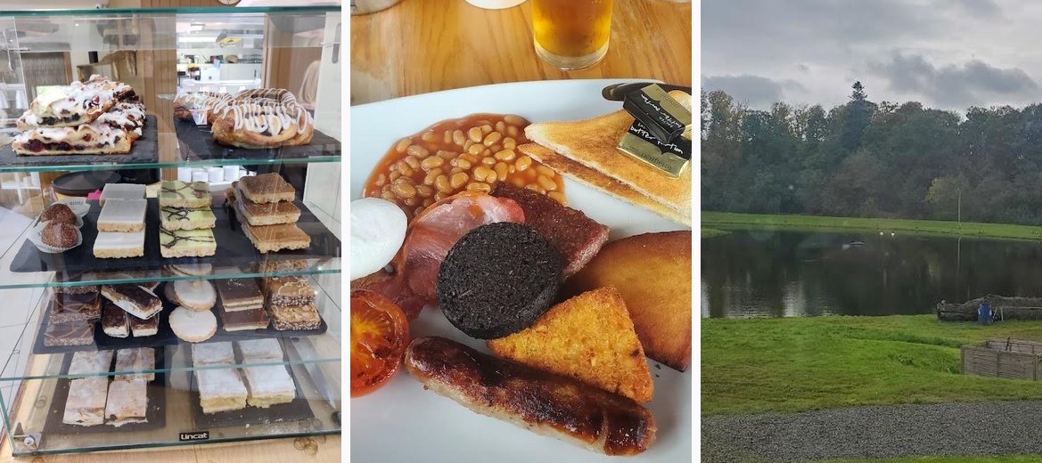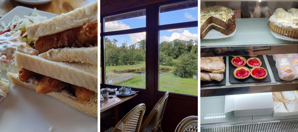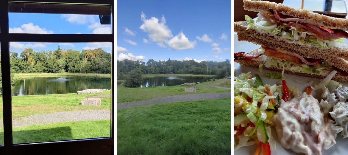 Lovely spot beside a fishing lake.Eat in or outside on decking.Great views.Plenty of parking and disabled parking right beside door.Food excellent and good sized portions.Extensive menu to suit all tastes both hot and cold.Pastry counter to die for great variety.Staff friendly and knowledge of menu was very helpful if u have any allergies.Reasonably priced will be back.